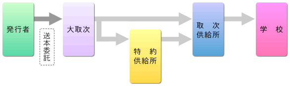 発行者が大取次および特約供給所と供給契約を結んでいる場合には、大取次は発行者の委託を受け、取次供給所(一部は特約供給所を経由する。)に送本し、取次供給所から学校へ供給されます。