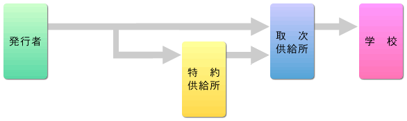発行者が特約供給所と供給契約を結んでいる場合には、発行者は取次供給所(一部は特約供給所を経由する。)へ送本し、取次供給所から学校へ供給されます。